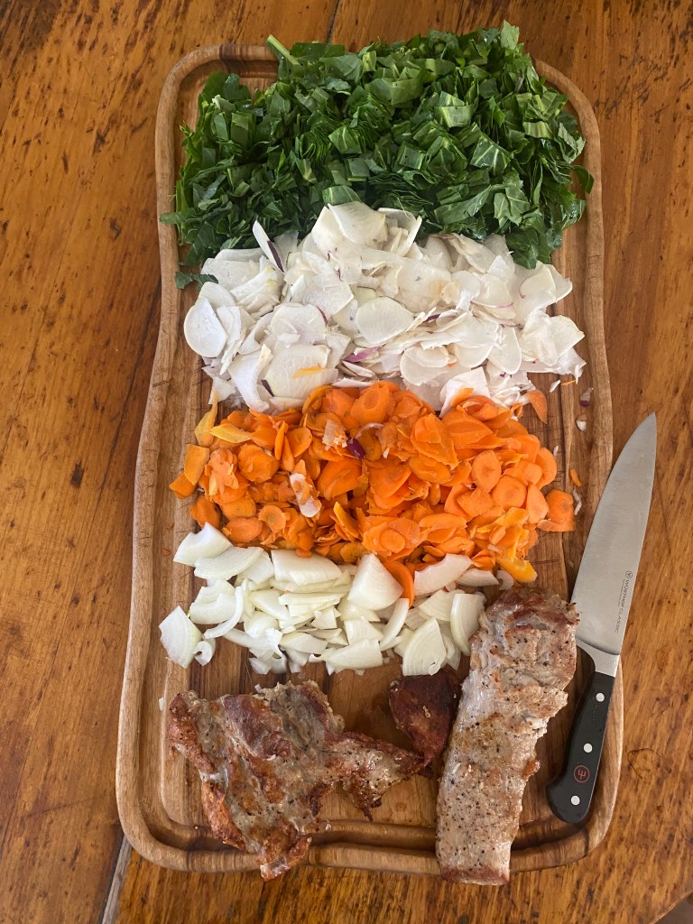 Next, add a bit more fat to the pan and throw in the onions. Stir them around a bit until they start to soften and smell nice. Next throw in the carrots, stir them around until they are hot all the way through. Next add turnips or cabbage, and garlic, if using, stir around until this is hot all the way through, then throw in the greens and a dash of salt. Stir everything around until it is cooked through, then add in the meat and the meat juices. Taste, and add any other flavourings – for this pork stir fry I used a big chunk of honey, about half that amount in coconut aminos, and then a dash of cider vinegar.