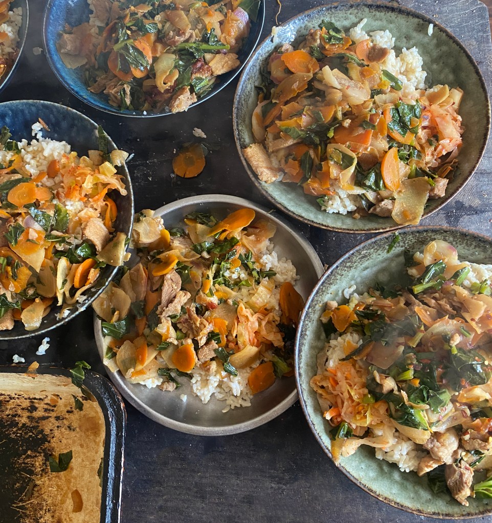 For the stir fry in the photos, I used misshapen bits of pork loin that I’d messily butchered, they were thicker in some places than a steak, so I just roasted it instead of frying it. You can also just use leftover bits of roast meat.